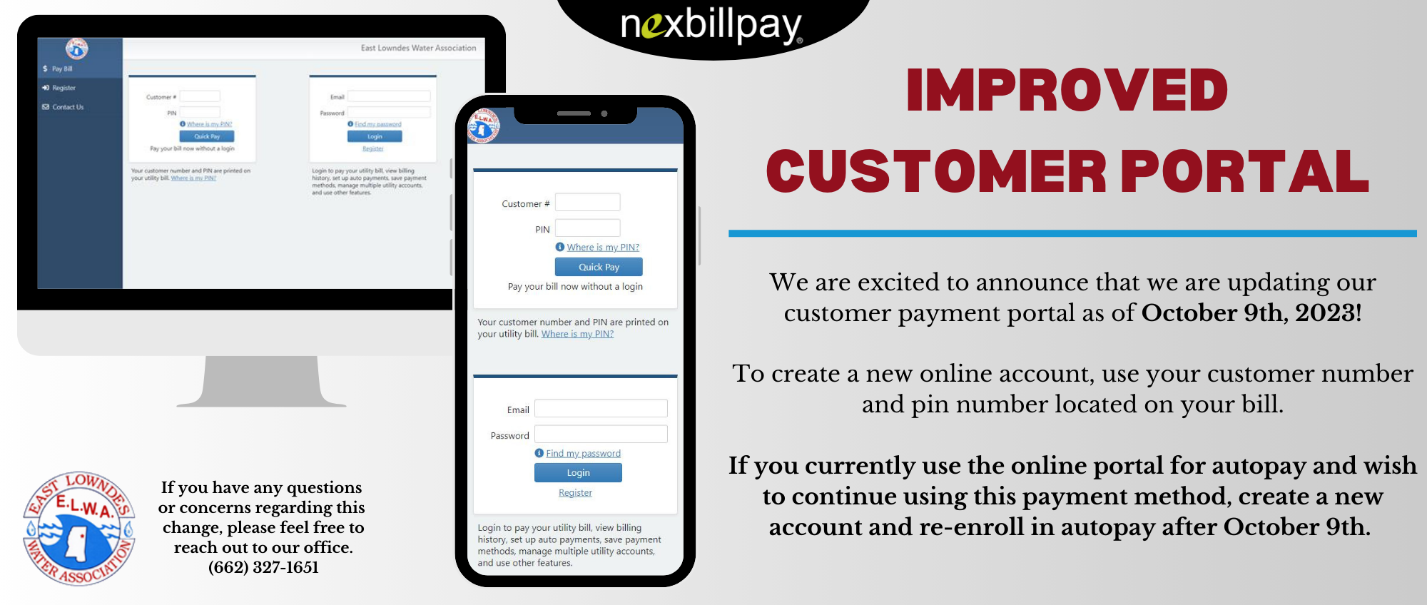 New Online Payment Portal is now live! Click the image above. See below for more info. View Your Account and Make Online Payments 24 hrs a day, 7 days a week! You can also View Your Account online without making a payment. Your PIN is located on your bill.
