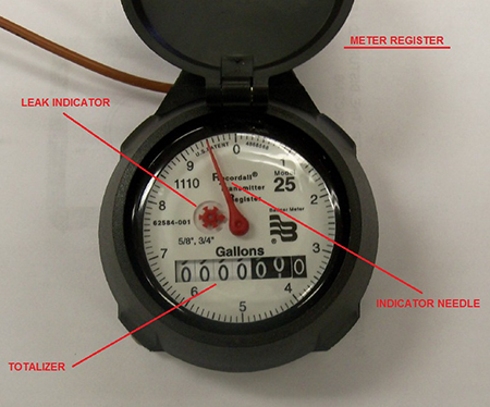 The Association’s meters measures water in U.S. gallons by a totalizer (like an odometer) on the face of the meter register (under the register lid – see picture).